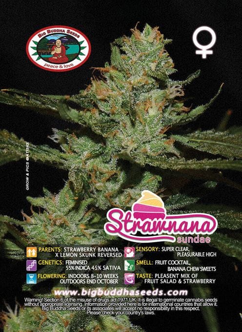 Strawnana Sundae, a hybrid strain, is the progeny of Strawberry Banana and Lemon Skunk Reversed, leaning slightly more towards indica with a 55% dominance. It is a notably tall plant, capable of reaching heights over 150 cm indoors and exceeding 200 cm outdoors, reportedly requiring an 8 – 10 week flowering period when grown indoors. This strain is characterized by its copious yields and the distinctly fruity aroma and flavor of its buds. Its effects are recognized for their clarity and uplifting nature.