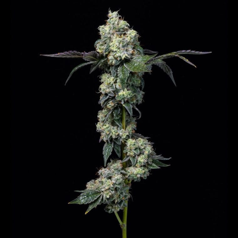 Produces two phenotypes: short and bushy, tall and upright. Dark purple flowers, heavy weight. New hybrid with gassy gelato flavor.