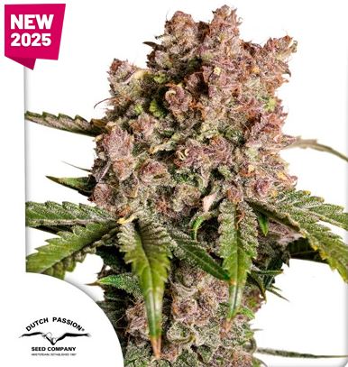 Indica dominant with purple buds, fruity aroma, high trichome density, fast flowering, powerful THC, relaxing high.