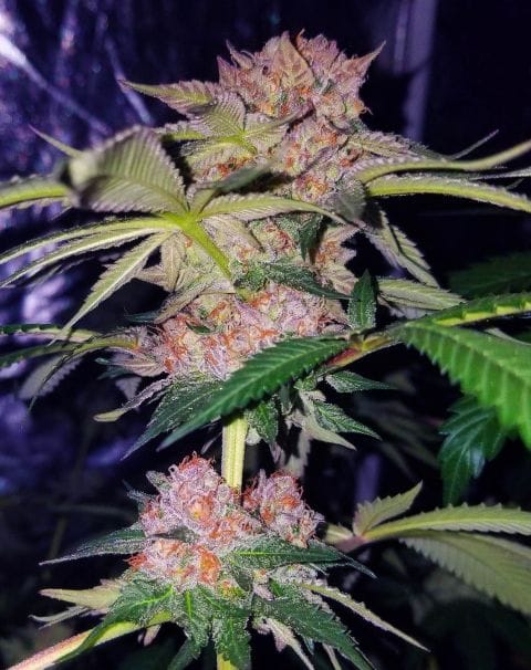 Mimosa Champagne features medium to large buds with a captivating color palette of dark green, purple, and blue, boasting exceptional bag appeal. It maintains a compact stature due to its Indica heritage, producing dense cone-shaped buds covered in white trichomes.