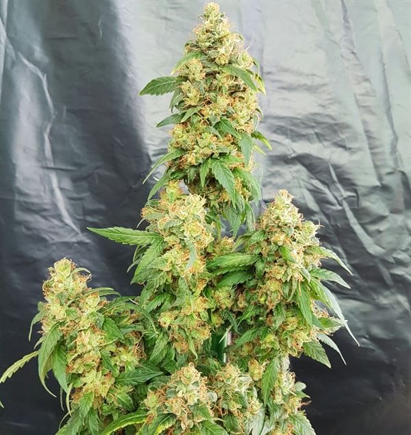 Potent strain with strong high, high THC production, and high commercial yield. Easy to grow indoors and outdoors, with sweet, skunky, fruity flavors.