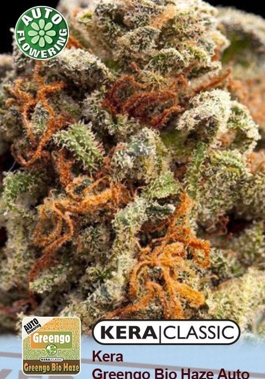 The Kera Greengo Bio Haze AUTO, developed through extensive research, is a leading auto-flowering cannabis strain that promises high quality and ease of growth. This strain is specially designed for those who seek a hassle-free cultivation experience, ensuring a quick and automatic flourishing process. It is an adaptation of the popular Haze strain, featuring an easy outdoor cultivation, promising a high yield with a plant reaching up to 180 cm in height and ready for harvest by October.