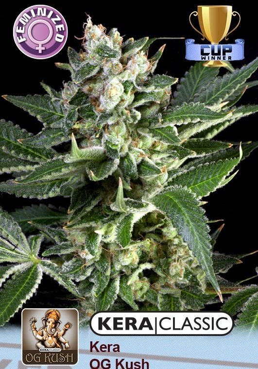 OG Kush is a standout for its growth pattern, slightly stretching before blooming into large, resin-coated lime green buds, and achieving a height of 90 to 160 cm. It’s now available in feminized form through the Kera Classic line. The strain promises a potent experience, blending intense mental stimulation with profound physical relaxation, alongside a memorable light citrus aroma and persistent aftertaste.