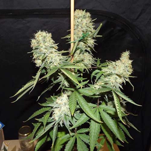 Popular strain with big yield, compact buds, strong smell. Short veg time for limited height. Strong high, 50/50 head and body effects.