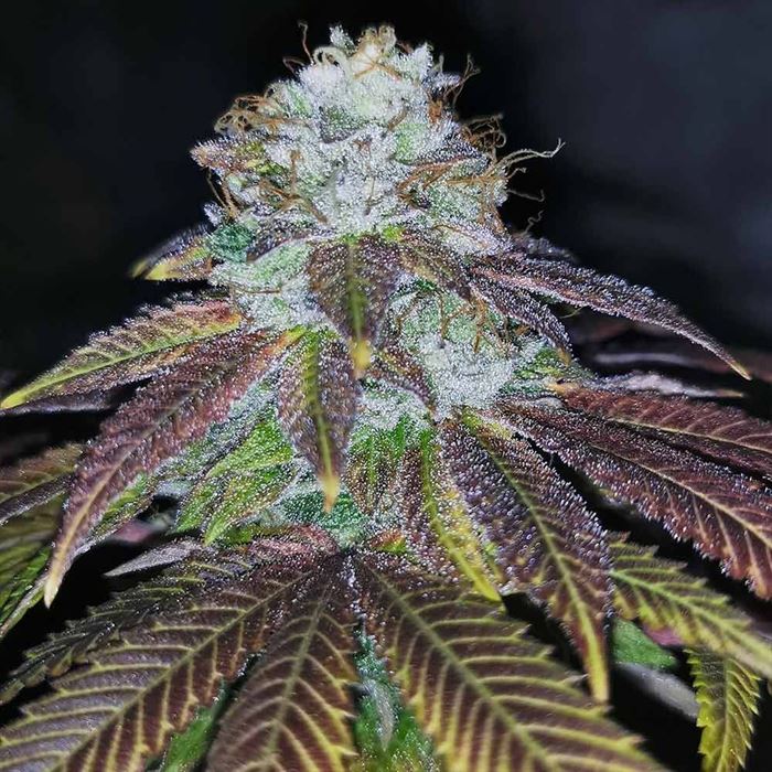 Bushy, large plant with purple and red colors. Strong fruity and sour terpene profile. Usually ready for harvest after nine weeks.