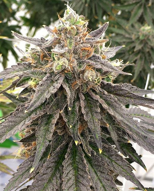 Medium yield with sweet/kushy flowers, purple buds, high trichome production, dense flowers, Indica-dominant, medium stretch, aromatic, uplifting potency.