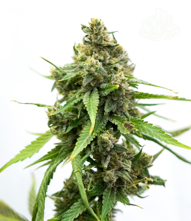 Balanced hybrid with sturdy genetics, 8 week flowering time. Dense buds with sweet, spicy, fruity flavors. Intense high starts cerebral, ends relaxing.